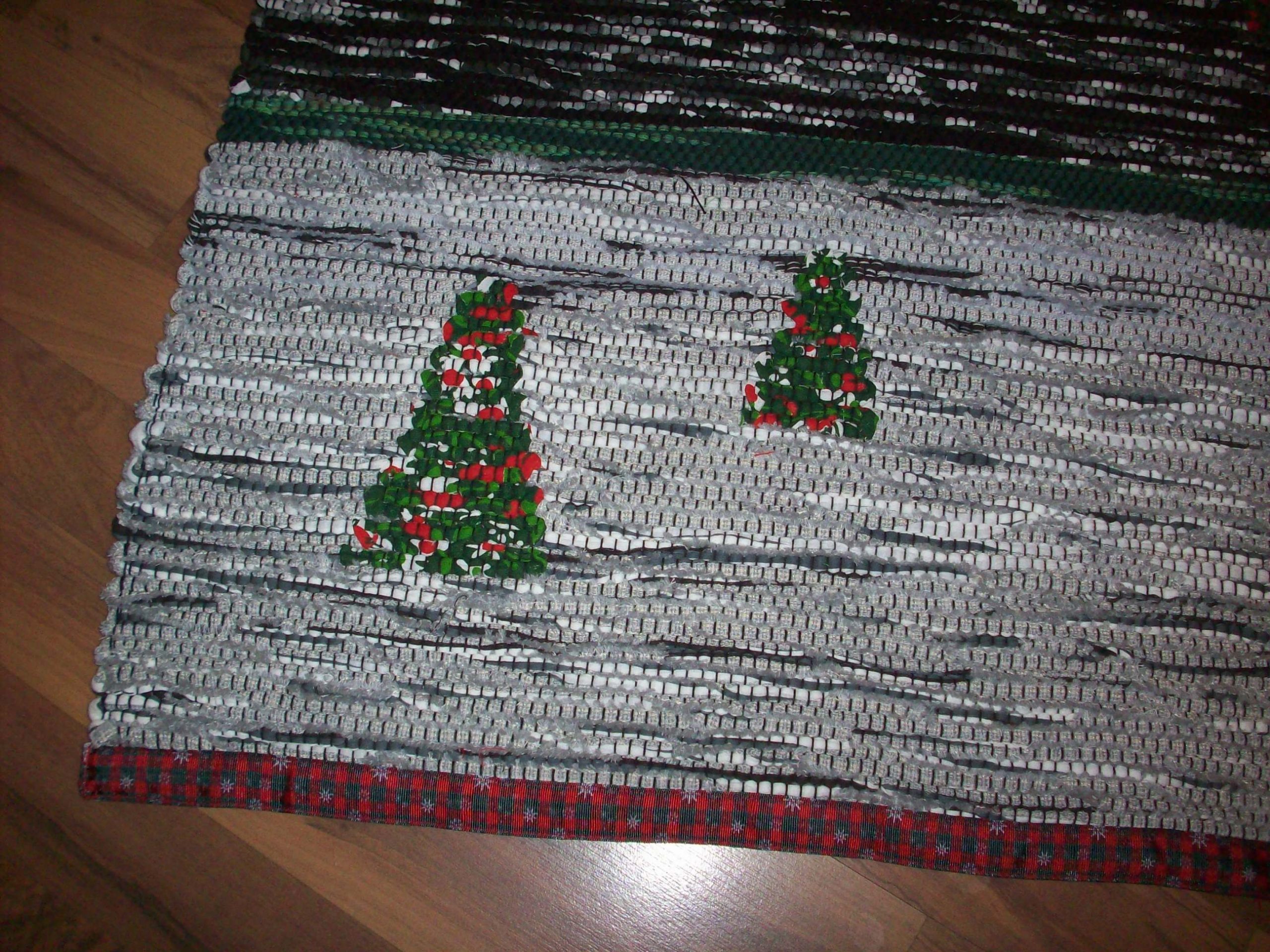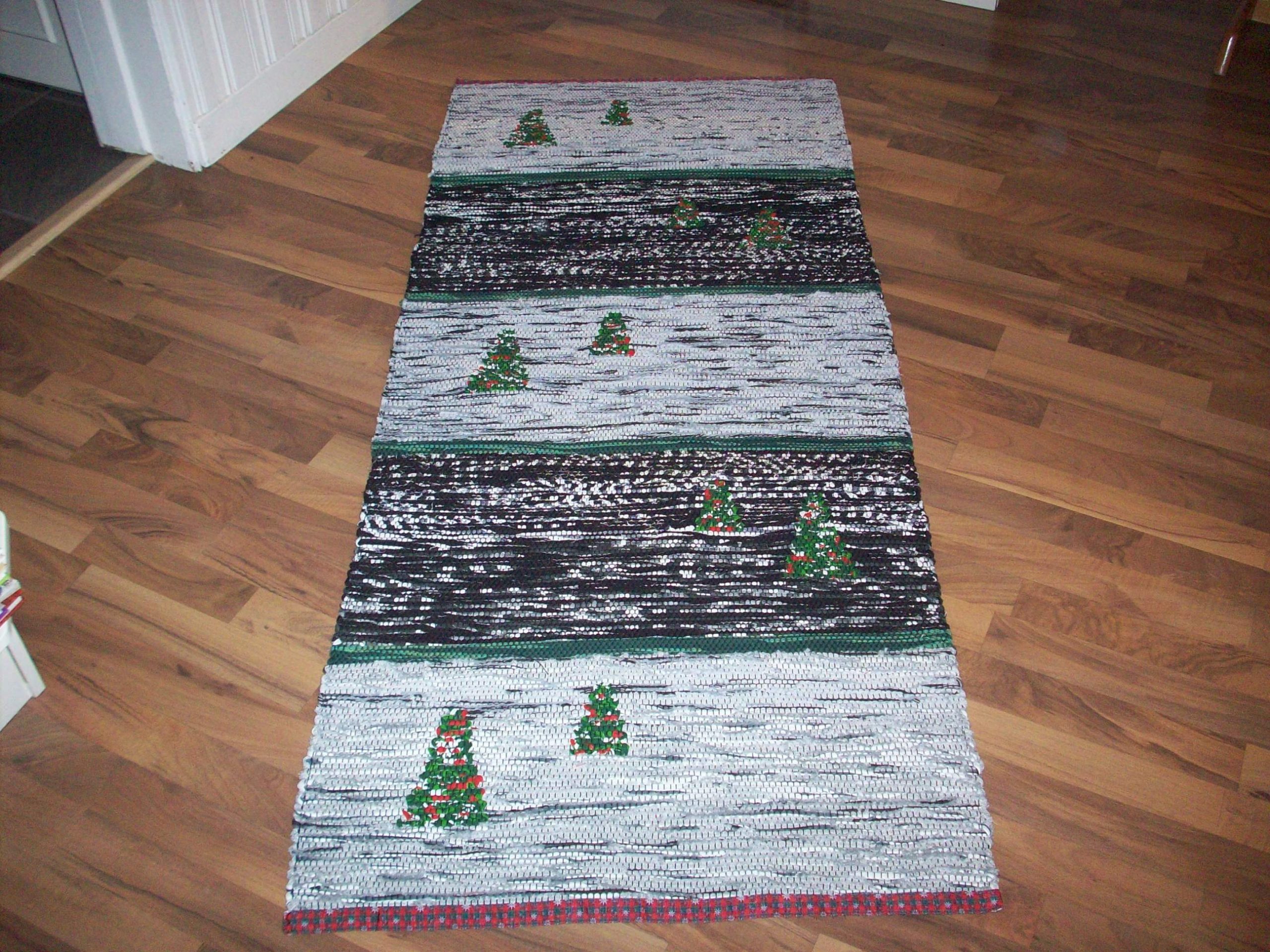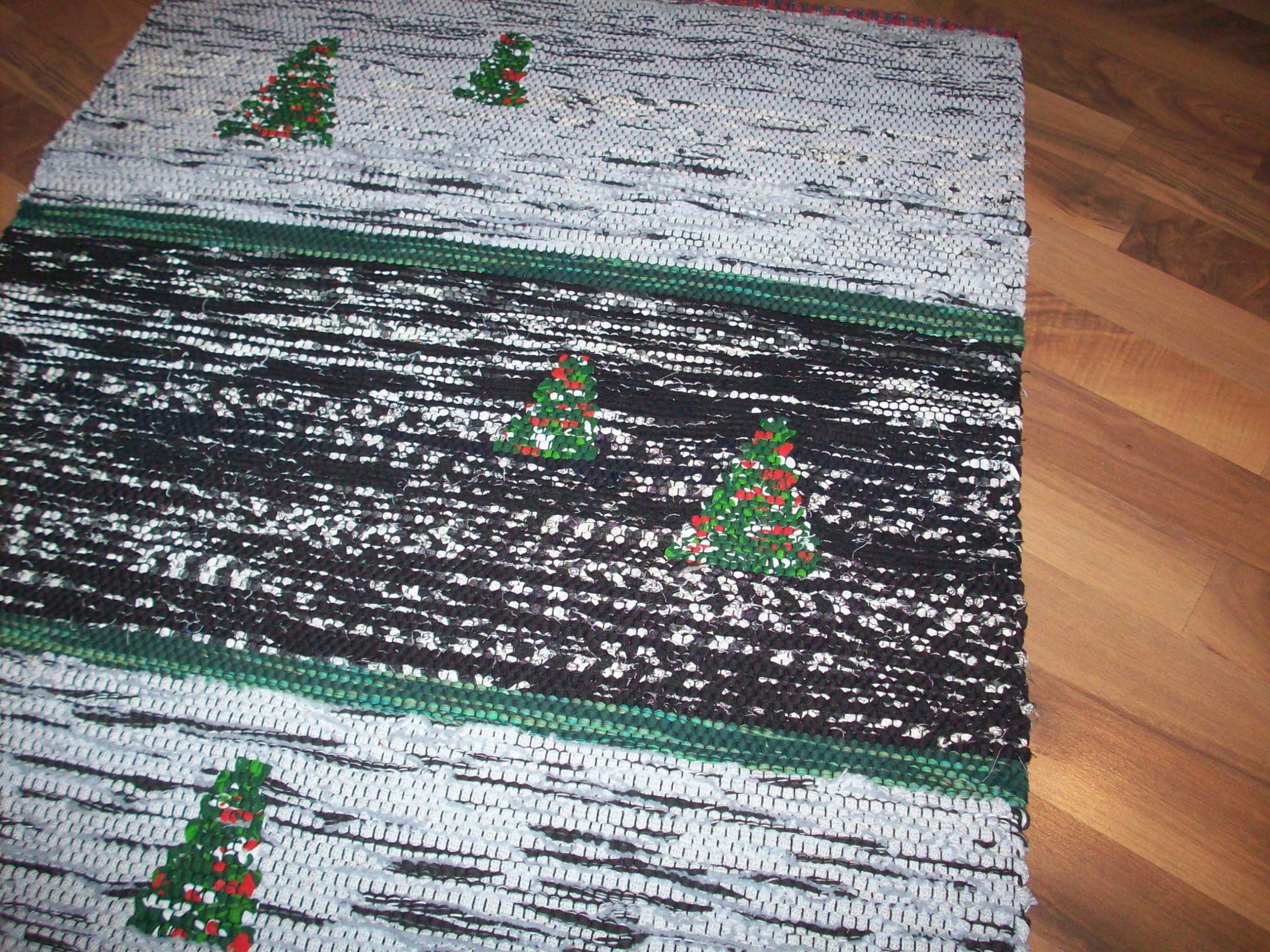 Handvävd trasmatta i grå/svart med inplockade julgranar. Mattan är vävd i