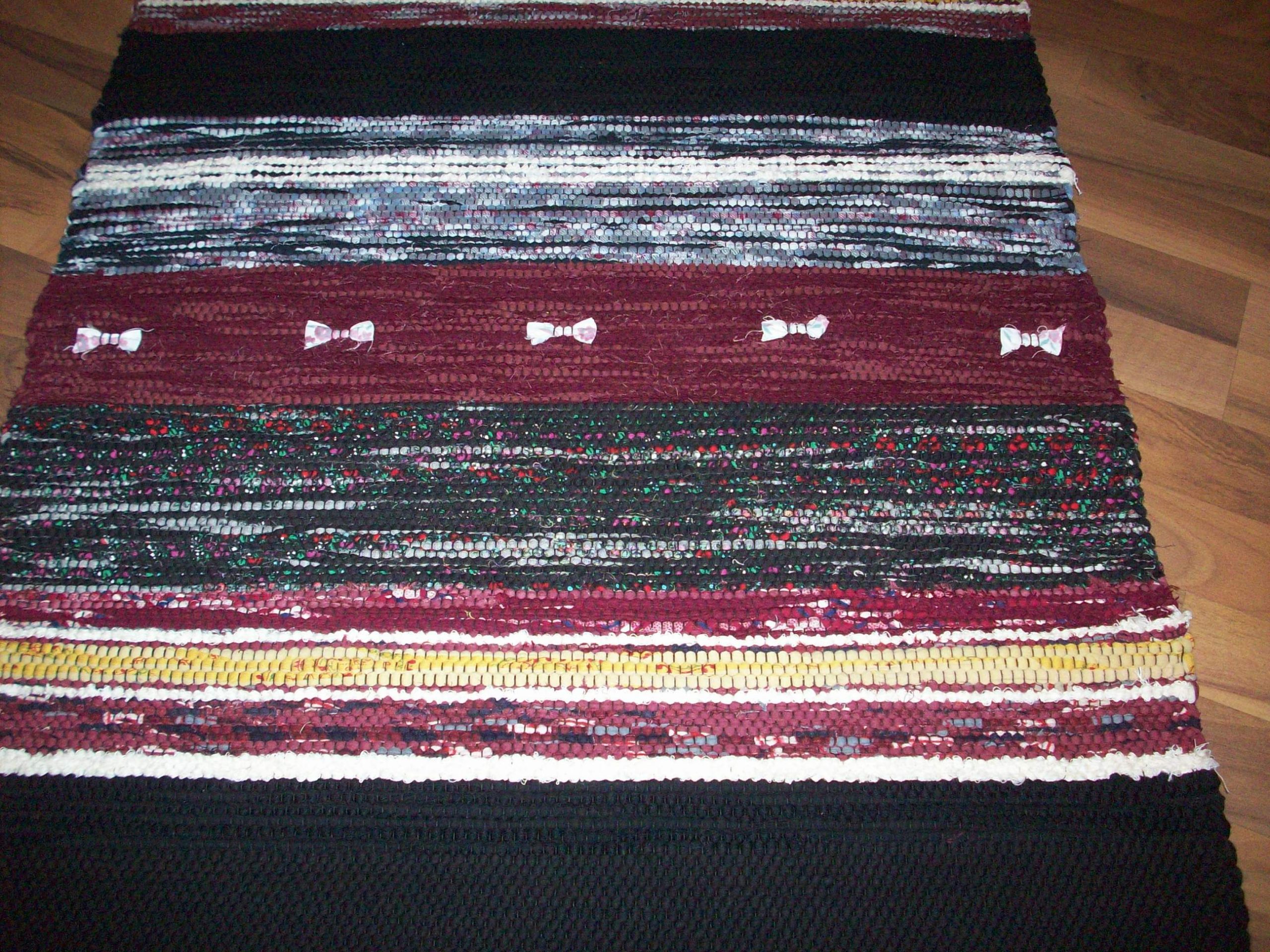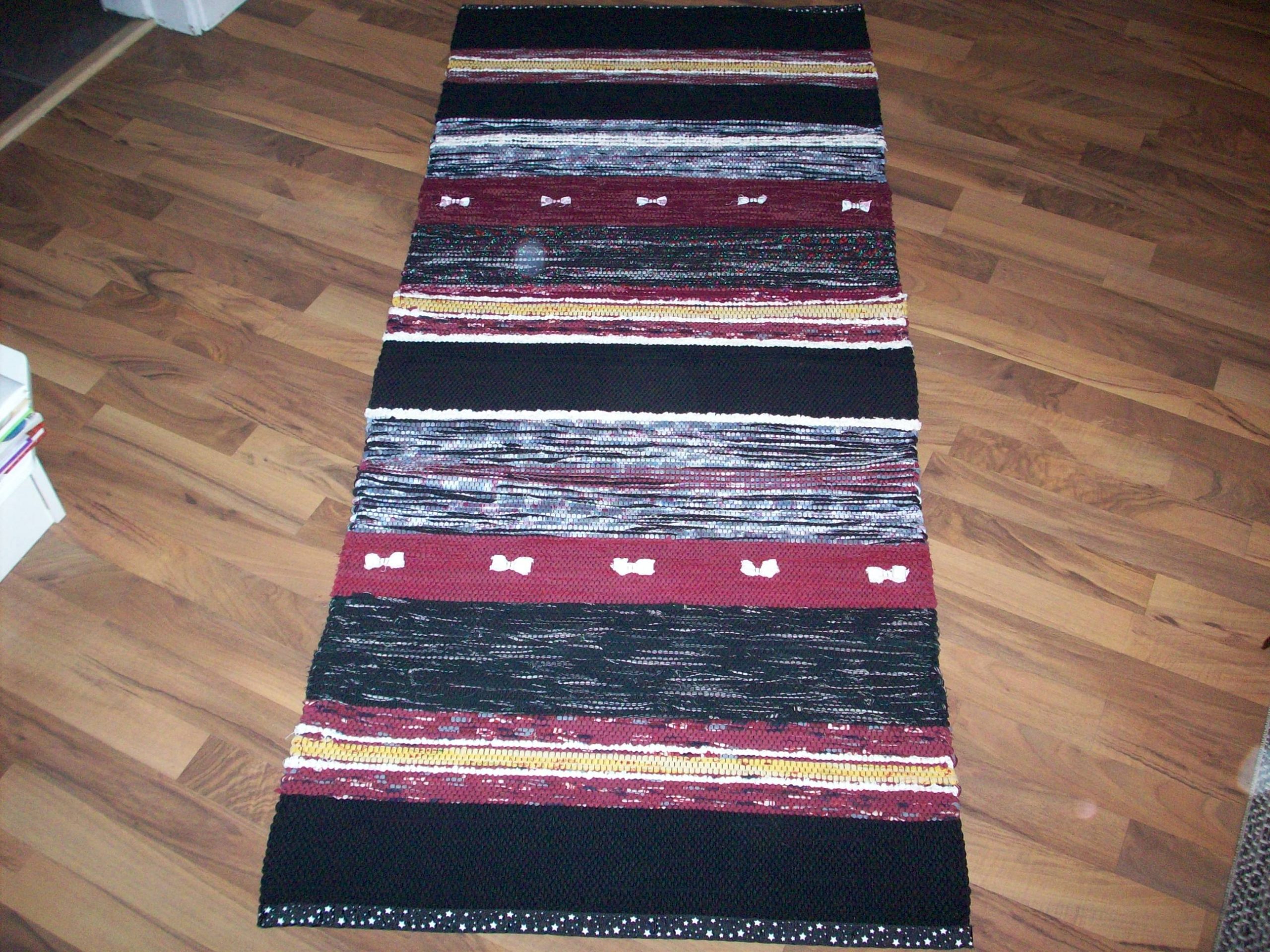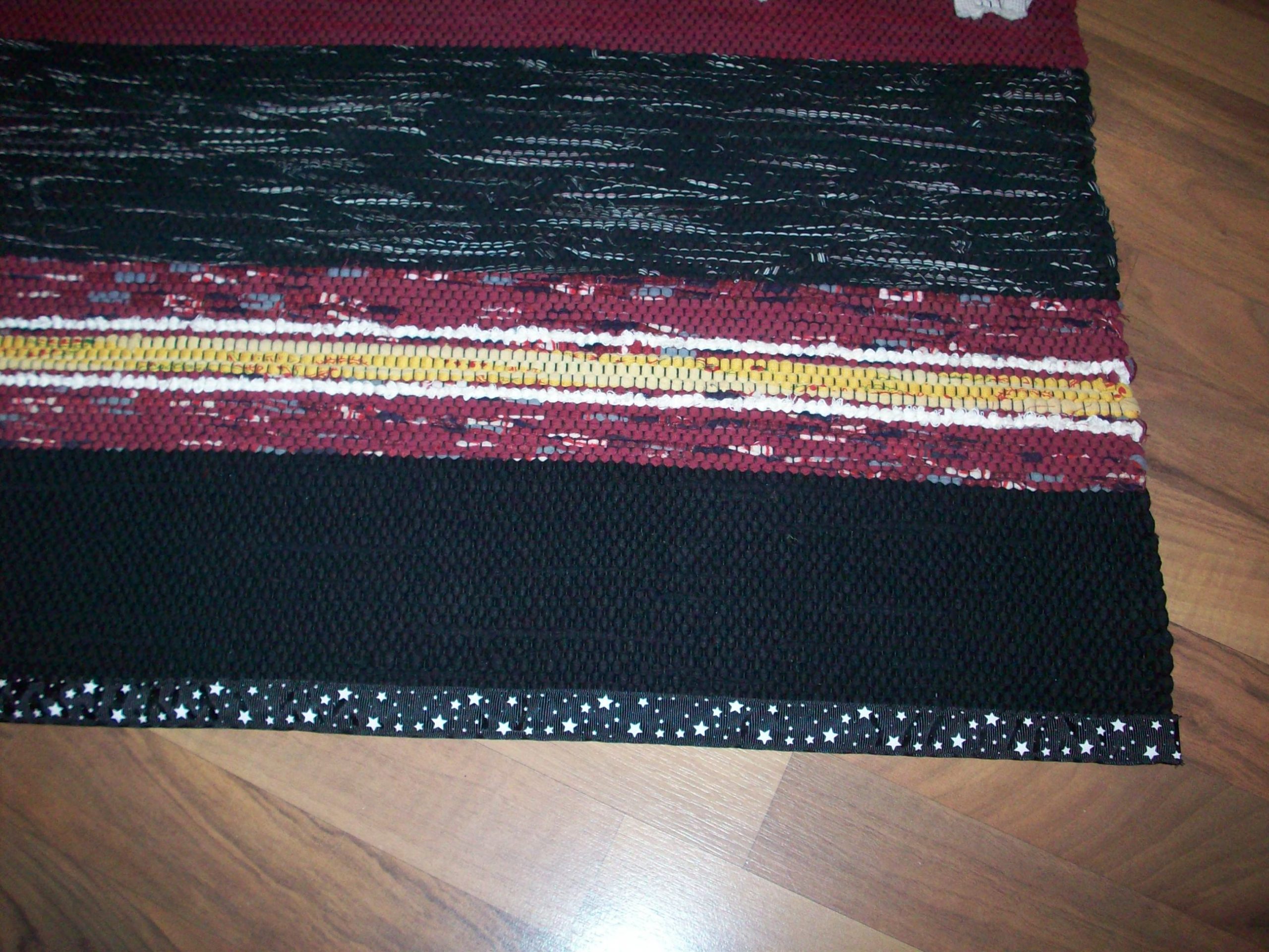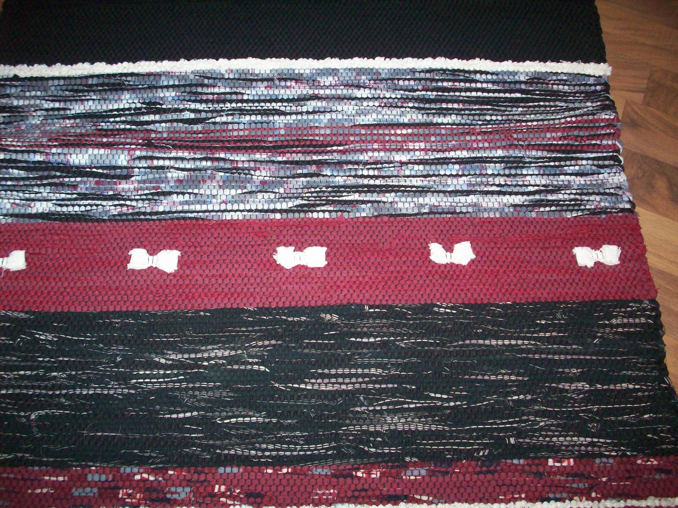 Handvävd trasmatta i varma färger. Mattan är vävd i tuskaft med inslag av slarvtjäll. Som avslutning har den band istället för fransar. Mattan är 1,70 lång och 0,70 bred.