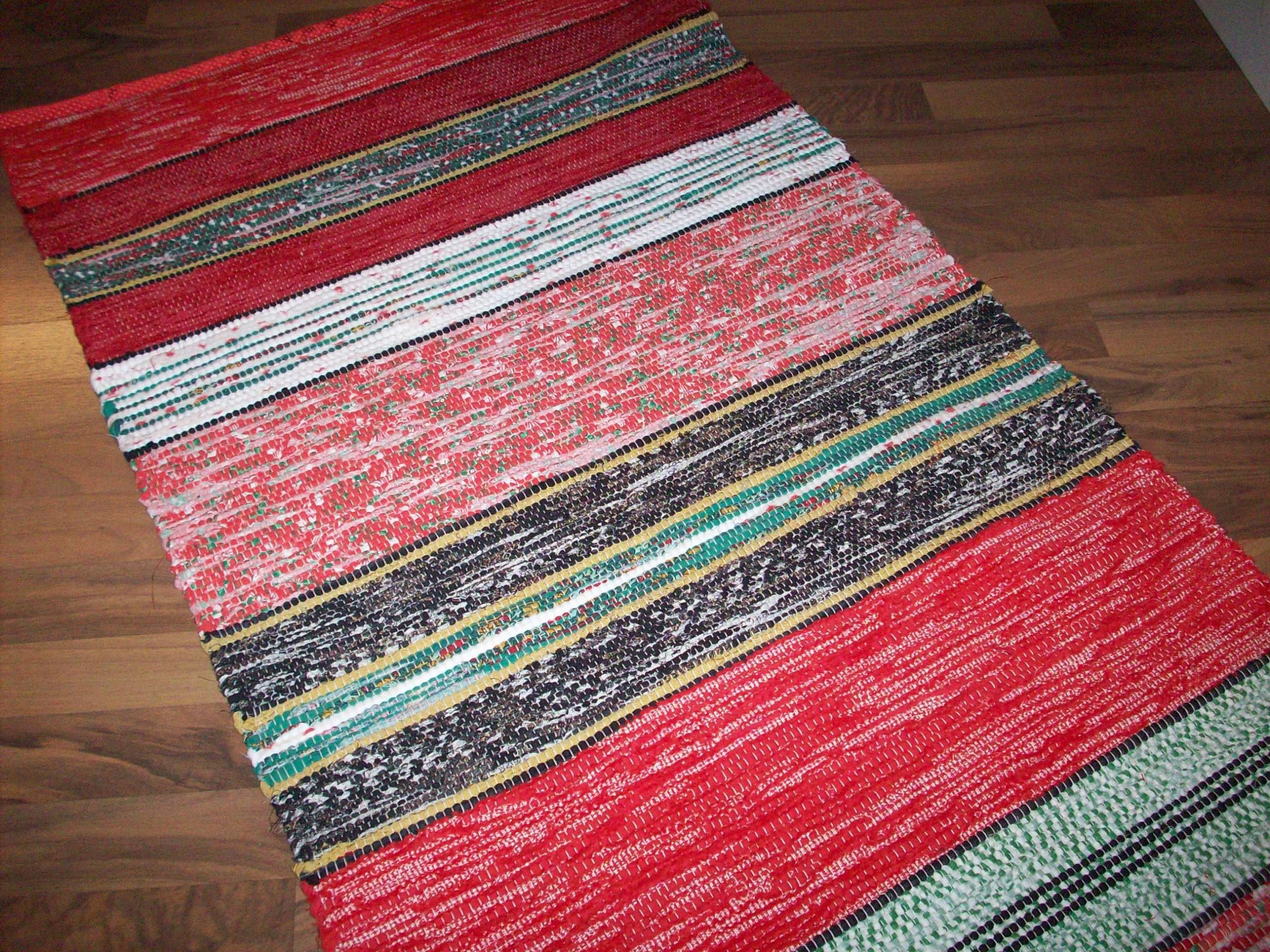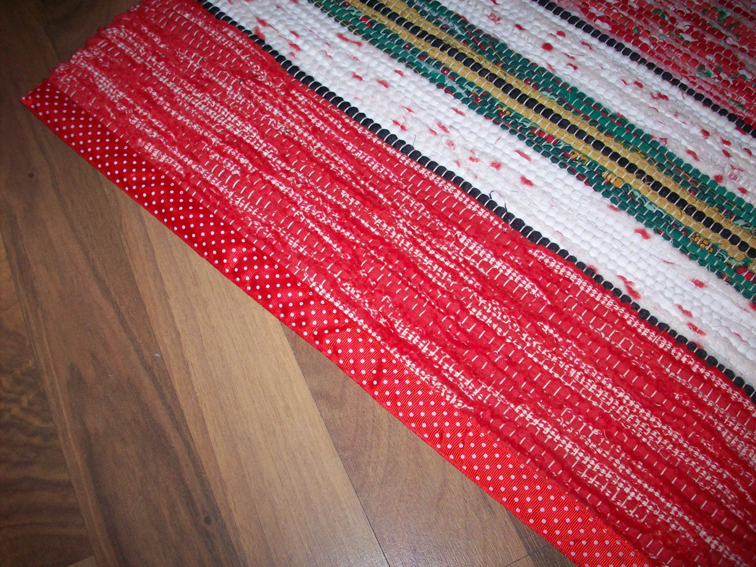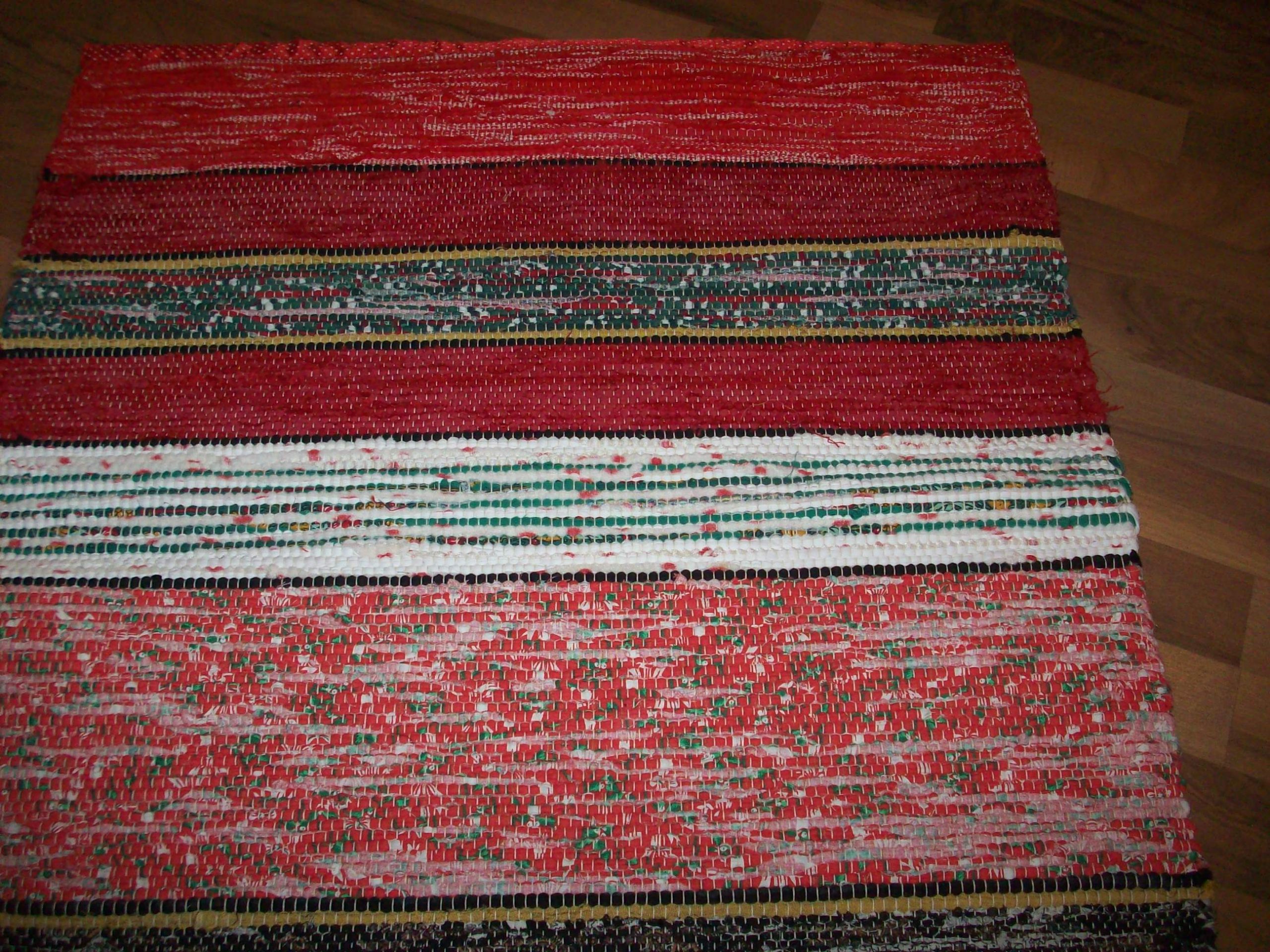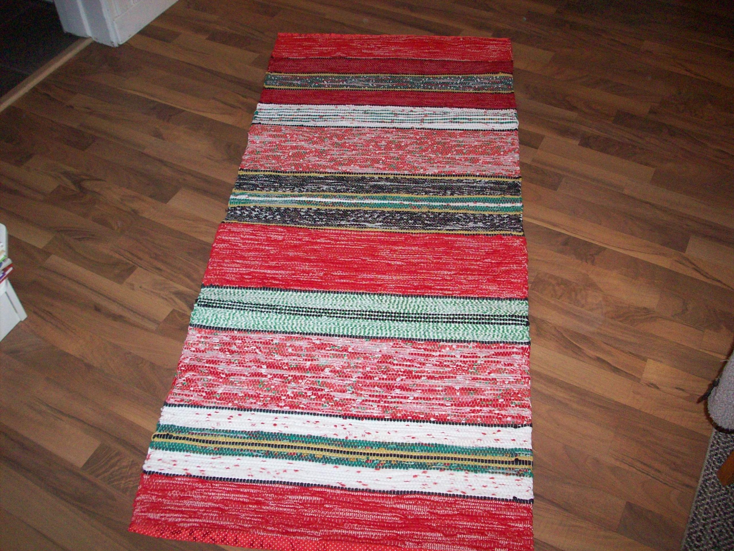 Handvävd trasmatta i julens varma färger. Den är vävd i tuskaft. Mattan har band istället för fransar som avslutning. Den är 1,70 lång och 0,70 bred.
